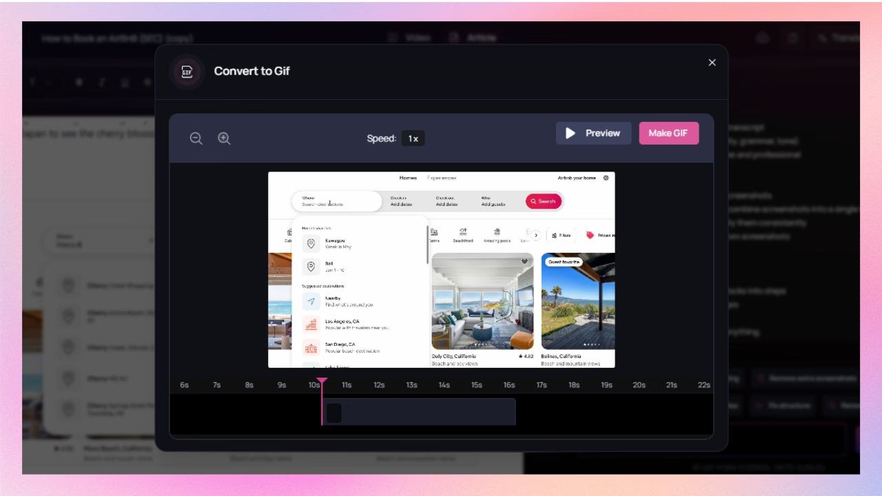 Clueso automatically captures screenshots from your product workflows and adds them to your written guides. You can also turn those screenshots into GIFs to create dynamic visual content that preserves cursor movement and interactions, making every step clearer and easier to follow.