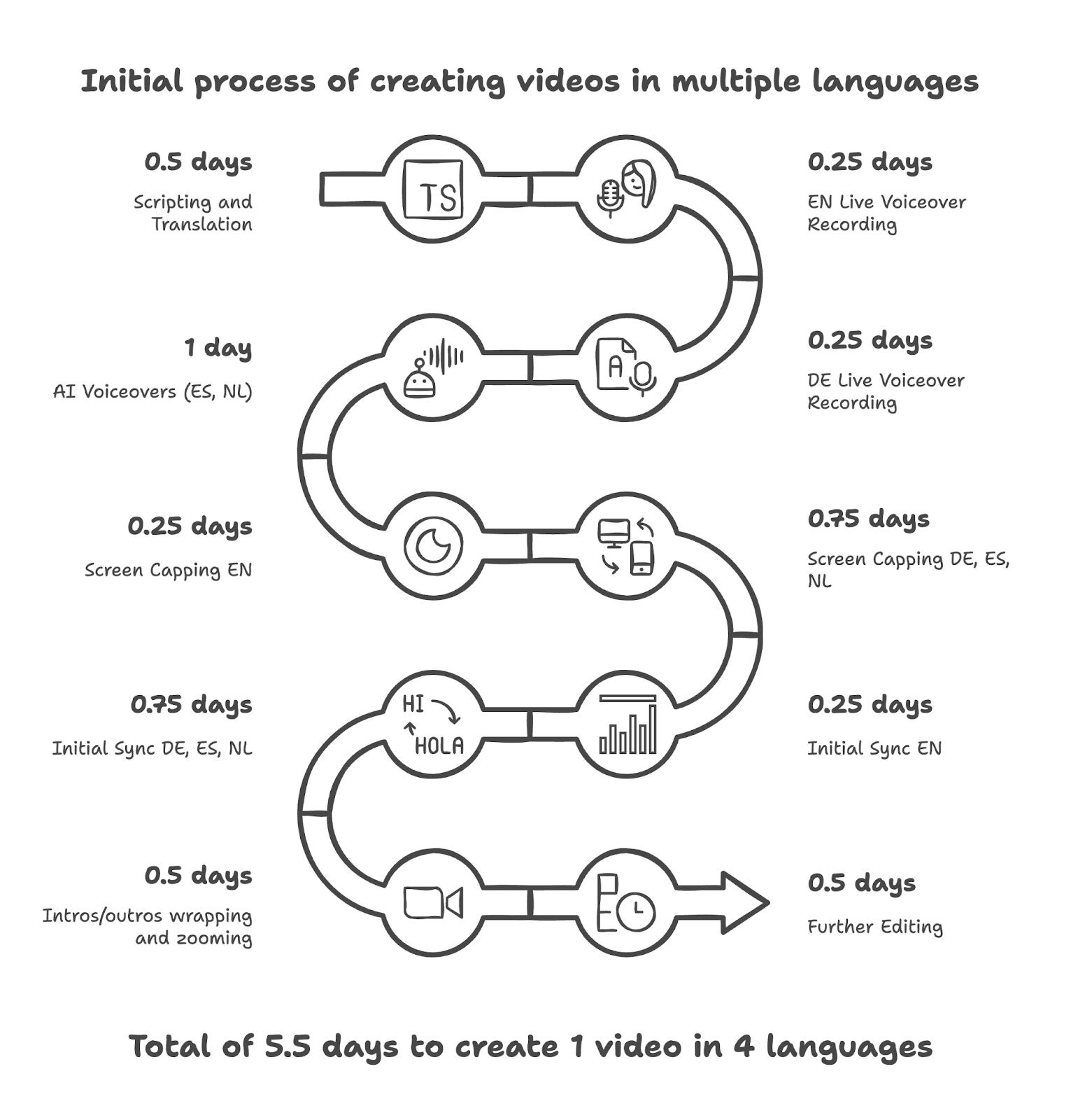 Time-Consuming Production: Creating a single video in English (EN), German (DE), Spanish (ES), and Dutch (NL) took 5.5 days, requiring script writing, screen recording, translation, audio recording, manual syncing, and editing.