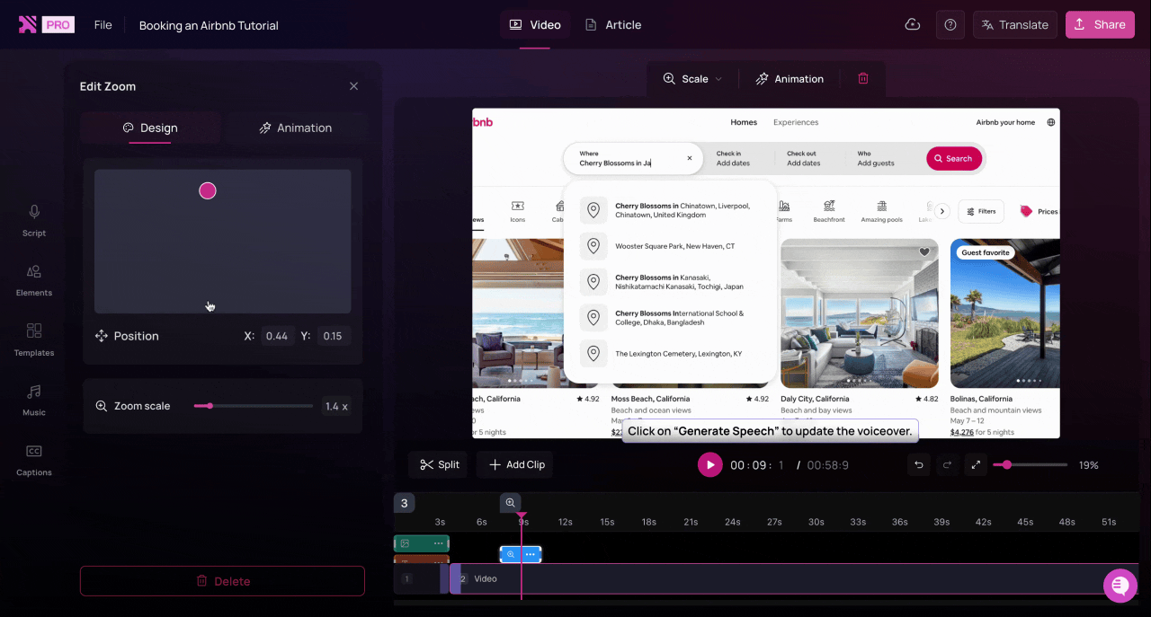 Editing on Clueso is largely automated. The AI detects sections, trims unnecessary pauses, and syncs narration for you.