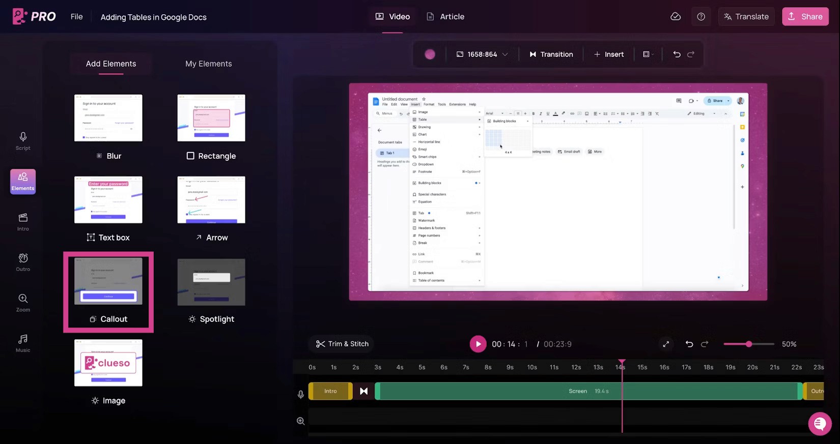 Clueso applies visual effects automatically based on detected actions — cursor spotlights, highlights, etc. Users can also add callouts, text animation, and transitions to elevate clarity.