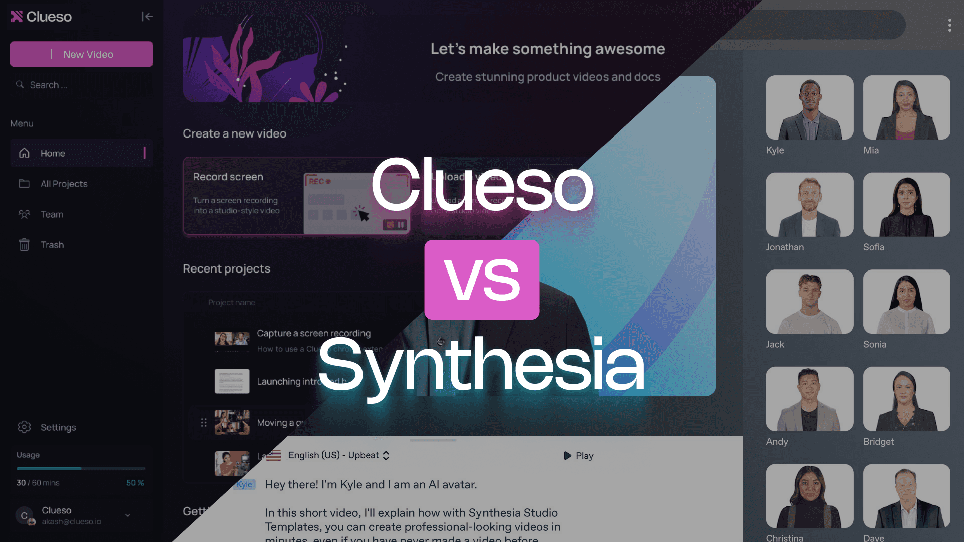 Clueso and Synthesia both use AI to help you make videos faster, but they serve very different creators. Clueso captures your real screen and automates editing and voiceovers. It is perfect for showing your product in action. Synthesia, on the other hand, focuses on avatar-driven, scripted videos.